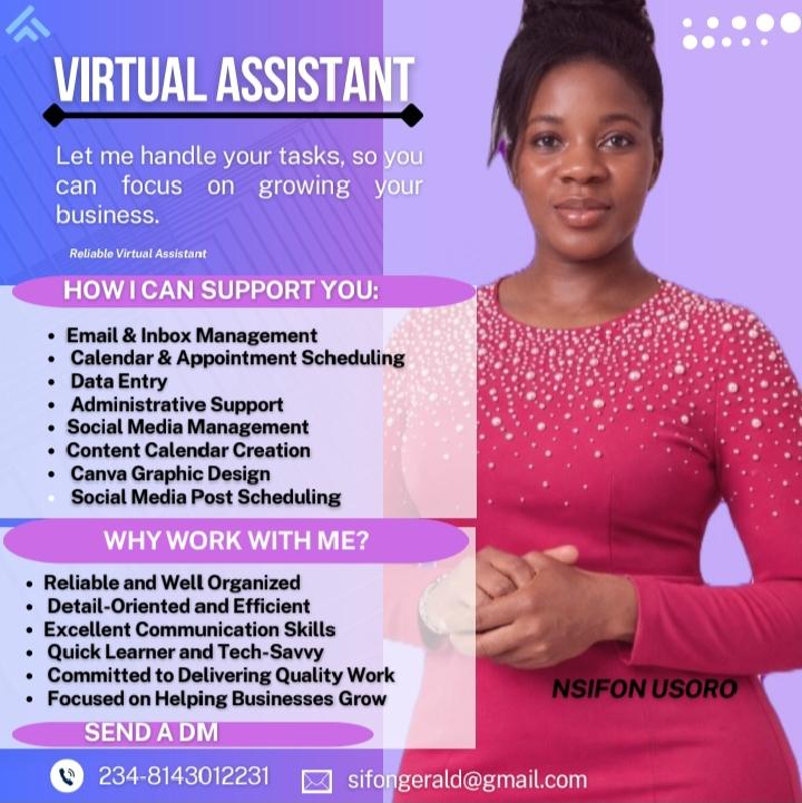 Through dedication and continuous learning, I have developed strong skills in virtual assistance, data entry, and graphic design using Canva. I can manage emails, organize schedules, handle administrative tasks, create engaging designs, and support businesses with social media management and content planning. These skills have helped me build confidence and prepare for real-world opportunities.